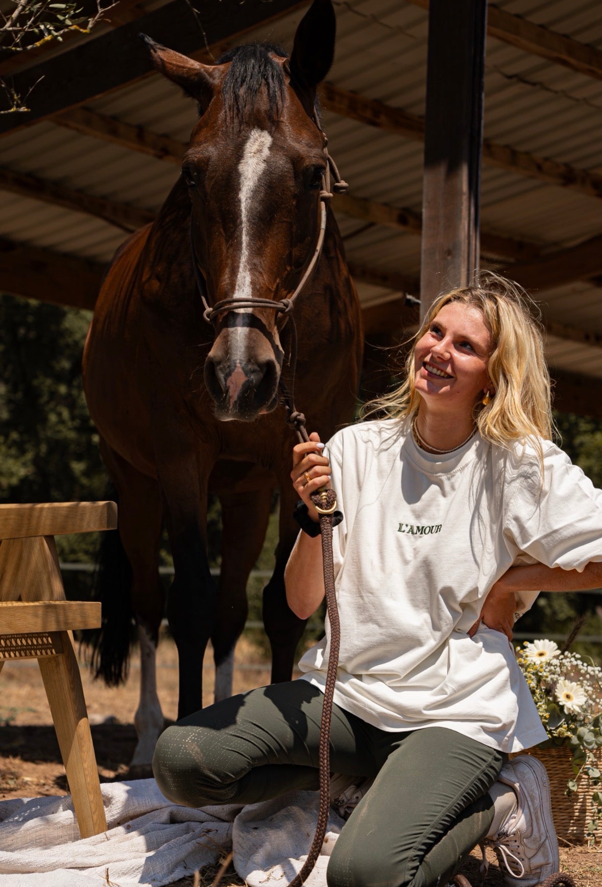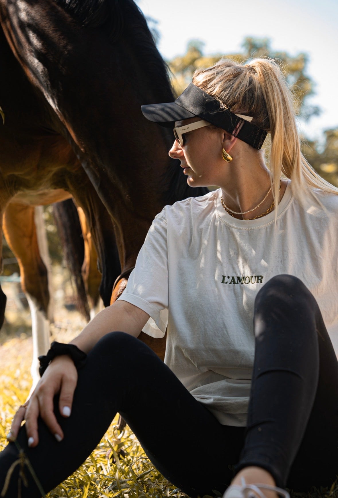 On déborde d'AMOUR pour nos chevaux. Et on aimerait le crier sur tous les toits, tout le temps. Sauf qu'on ne peut pas, parce-qu'on passerait pour des fous. (Oui.). Avec ce t-shirt L'AMOUR, les règles changent, et on peut enfin afficher avec style notre dévouement pour ces petites boules de poils de 600kg.